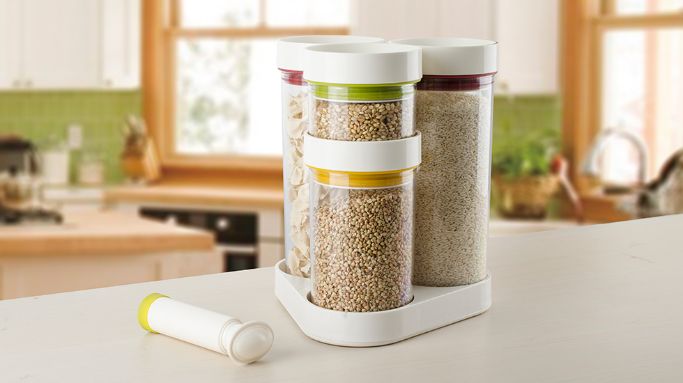 用可疊放的罐子來儲存你的雜糧或者其他調(diào)料會有效增加你架子的占用率,讓你可以放很多東西,又可以輕輕松松的拿取。