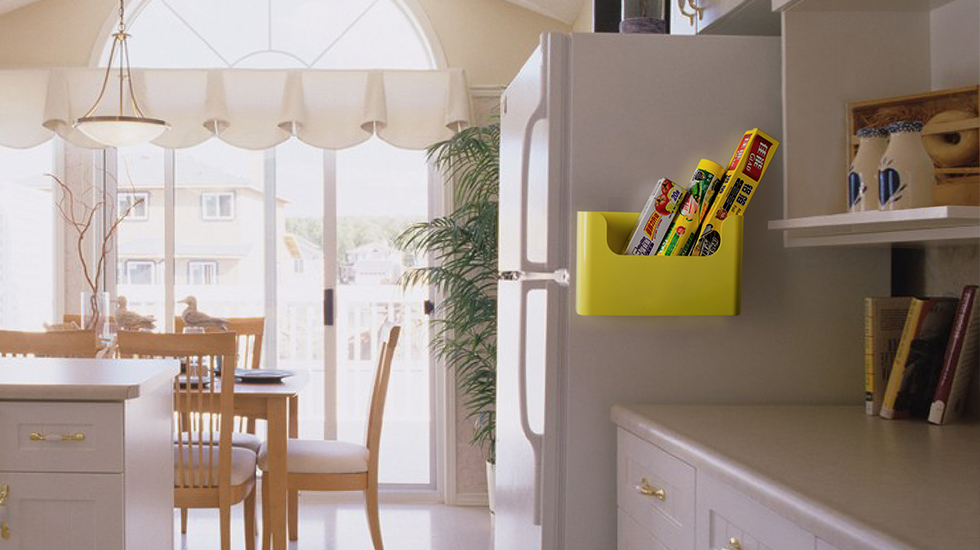 用掛式置物盒放保鮮膜,墻上、冰箱上的狹小空間也有效利用起來了。