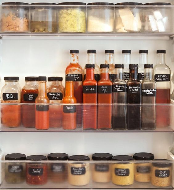 用一系列的罐子和瓶子儲存香料或液體調(diào)料等放在冰箱里,尤其是不經(jīng)常做飯的家庭,這樣做可以保持調(diào)料等的新鮮度,不會變干或變壞,而且會使冰箱空間變得更整潔。