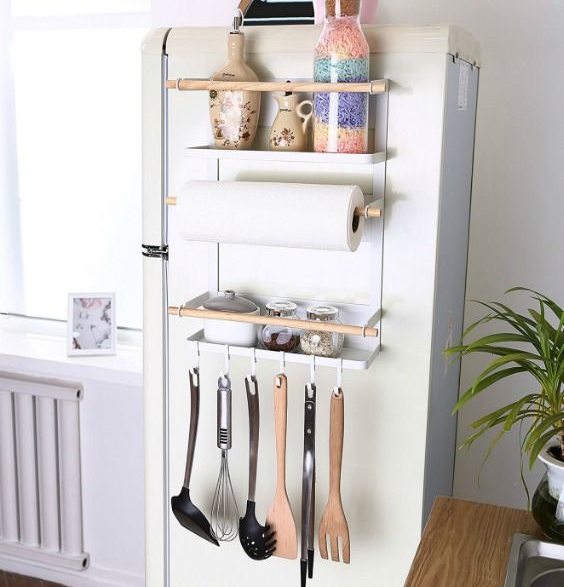 對于廚房來說,優(yōu)化每一個空間是你最需要做的。在冰箱側(cè)面空間安裝一個磁性冰箱架,可以存放你所有的保鮮袋、廚房用紙和其他工具,更加方便拿取。