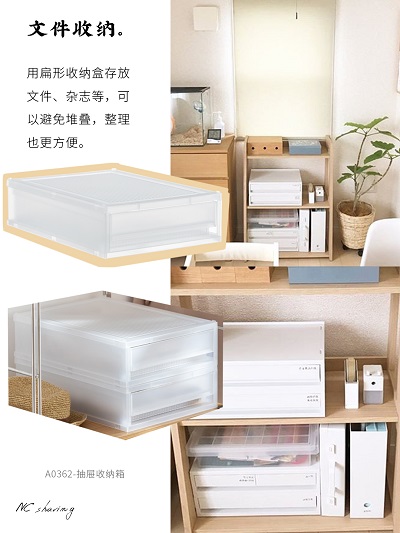 5.文件收納:用扁形收納盒存放文件、雜志等,可以避免堆疊,整理也更方便。