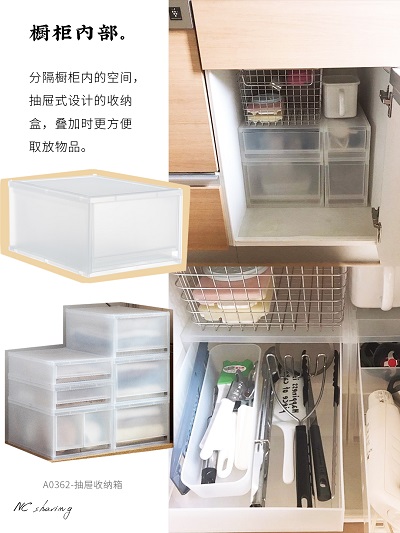 4.櫥柜內(nèi)部:分隔櫥柜內(nèi)的空間,抽屜式設(shè)計(jì)的收納盒,疊加時(shí)更方便取放物品。