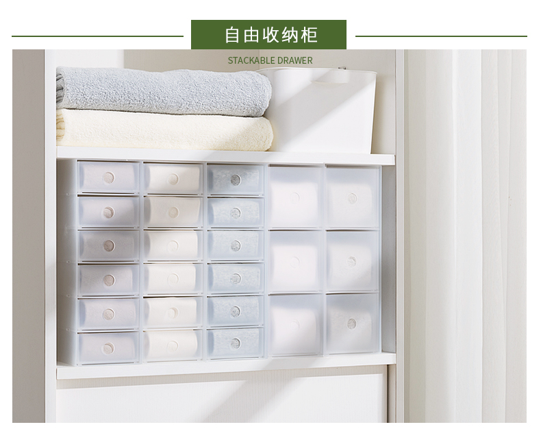 簡約透明磨砂的質(zhì)地比起五顏六色的高級了不少,多種不同規(guī)格的手呢盒,可根據(jù)自身需要進行組合排列,小巧U型的儲物盒,可收納大大小小的零散物件,背面的提手設(shè)計,讓移動省時省力,而且抽屜還做了卡扣,在搬運或者取物時不易掉落;有空讓抽拉變得更加方便;不同規(guī)格也能自由疊加,合理利用空間。
