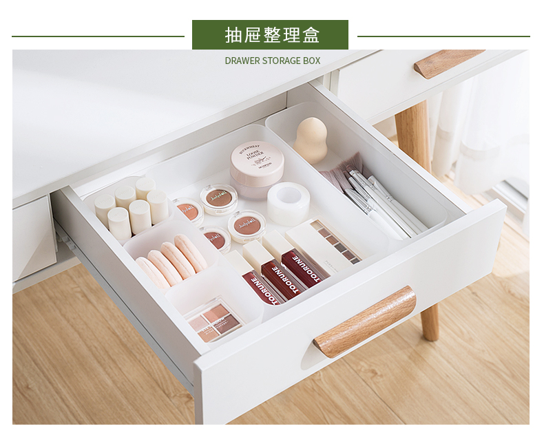 這套抽屜整理盒應(yīng)該說是比較實用的,不同規(guī)格的組合套裝,很適合各種規(guī)格不一樣的抽屜使用,廚房、臥室、書房均可使用。作為餐具收納,讓刀叉勺筷整潔有序,遠離雜亂;作為文具收納,零散小物件有了自己的歸屬地,學(xué)習(xí)工作效率提高了不止一倍;平常也可以作為藥品收納,分門別類,需要什么一目了然。透明磨砂的盒子不會看得十分清楚,保留私密性。