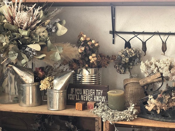 具有與鮮艷的鮮花不同的魅力的干花,深沉而別致的色調(diào)具有古典氣息。如果你不知道如何裝飾,只需將其捆綁后放入罐頭或錫罐就可以了,干花總是能與馬口鐵完美兼容。